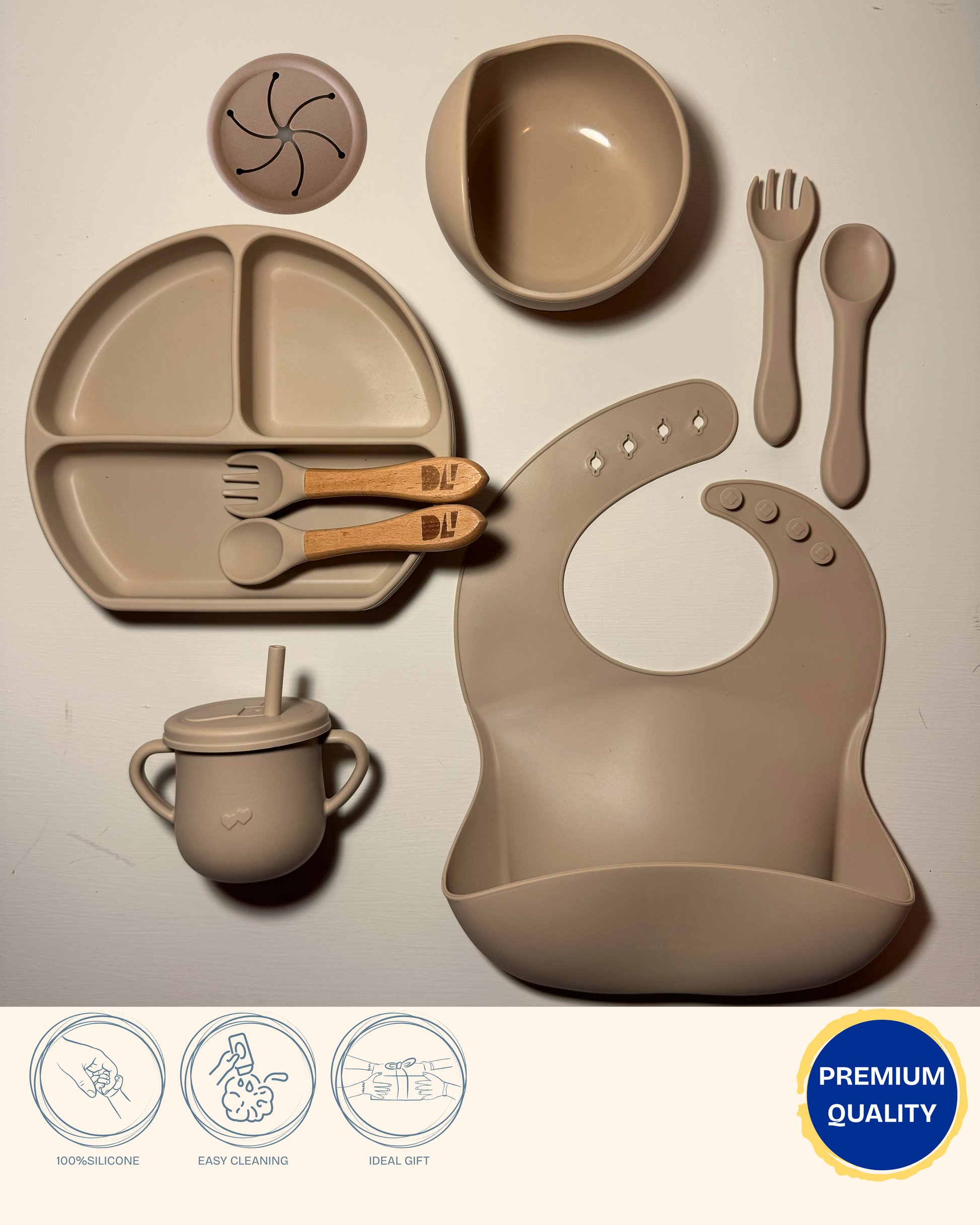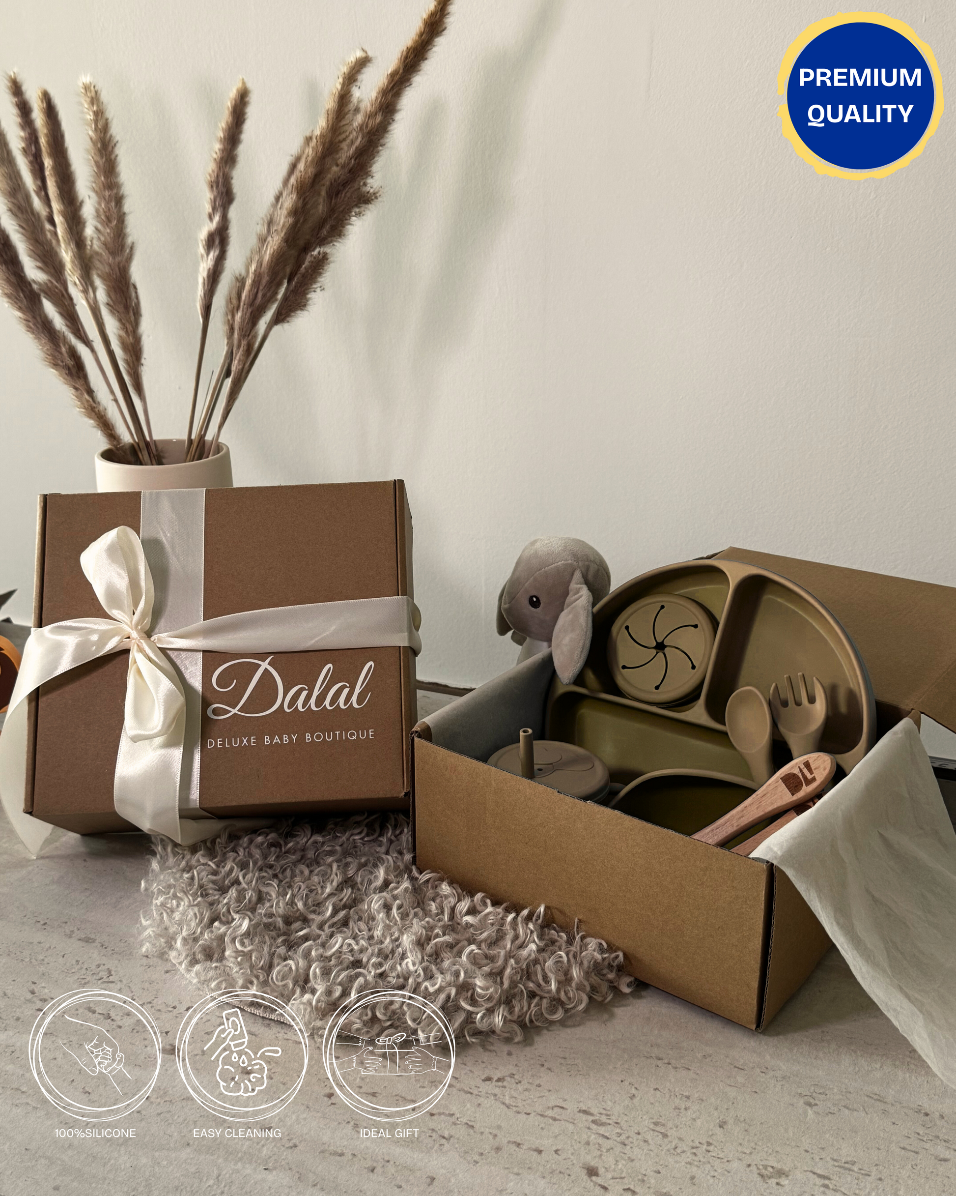 The Cloud – Beige Weaning Set by Dalal. Serene. Timeless. Our Cloud set embodies quiet elegance — a gentle beige hue that soothes the senses and blends beautifully into every home. Thoughtfully curated as a complete 9-piece set, it’s made from premium, food-grade silicone to support every stage of your baby's weaning journey.Presented in Dalal’s signature rigid box, delicately tied with silk ribbon, this set is more than functional — it’s a moment worth gifting.Includes: