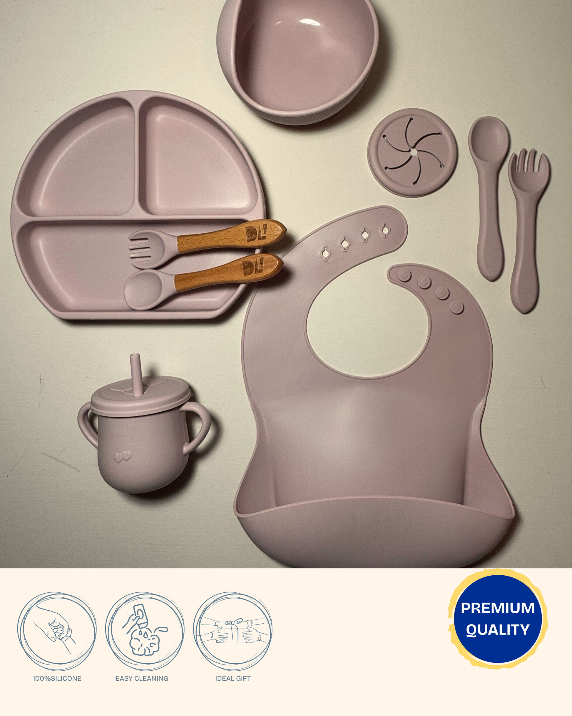 Our Petal set captures the gentle essence of early motherhood — a soft blush pink that feels warm, romantic, and endlessly tender. Designed for little hands and precious milestones, this 9-piece silicone set turns everyday feeding into a moment of beauty.
